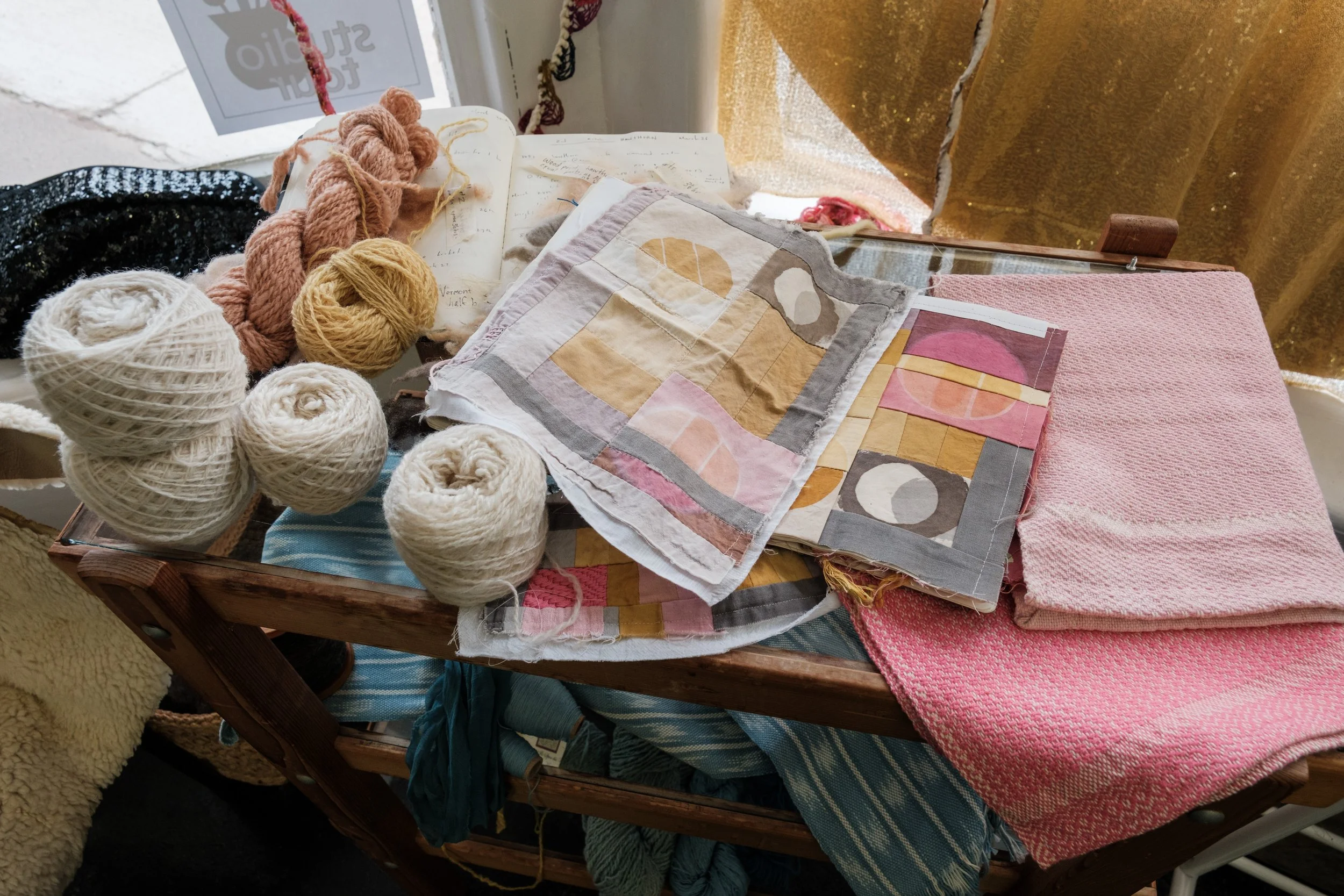 at the end of the day.Knitting, weaving, handmade clothing. Blues are indigo grown by the artist.